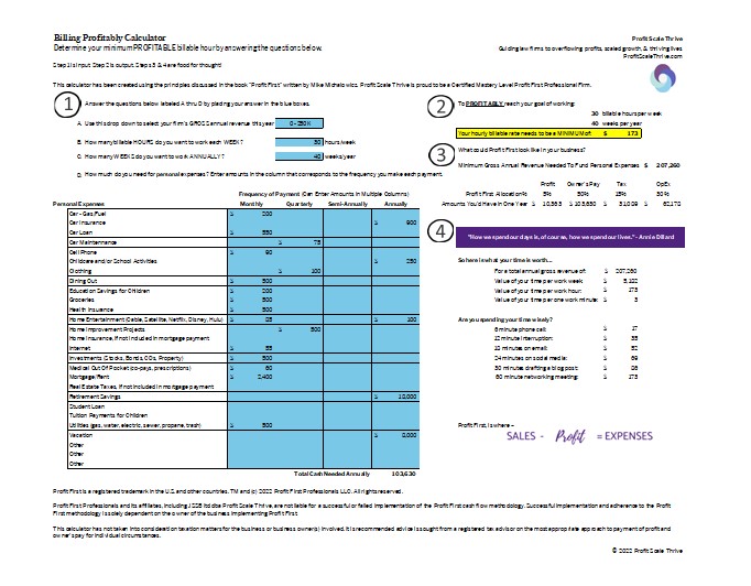 Download our Billing Profitably Calculator now to calculate the minimum hourly rate you need to bill in order to PROPERLY and PROFITABLY pay yourself.
