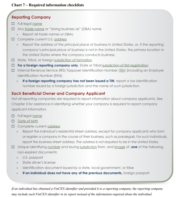 *** See excerpt below of the information to be reported as shown by Chart 7 in the BOI Small Entity Compliance Guide (full document provided by FinCEN here).
