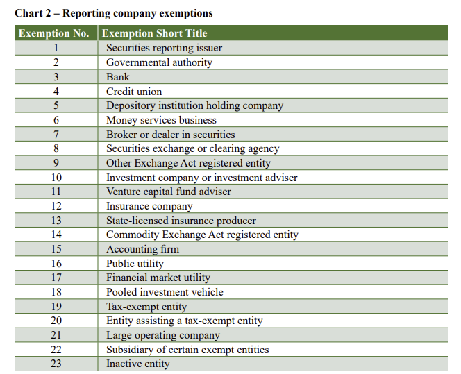 There are 23 categories that are exempt*, including publicly traded companies, banks, credit unions, and tax-exempt organizations. However, these exemptions are specific, and many of these groups already follow other reporting rules.